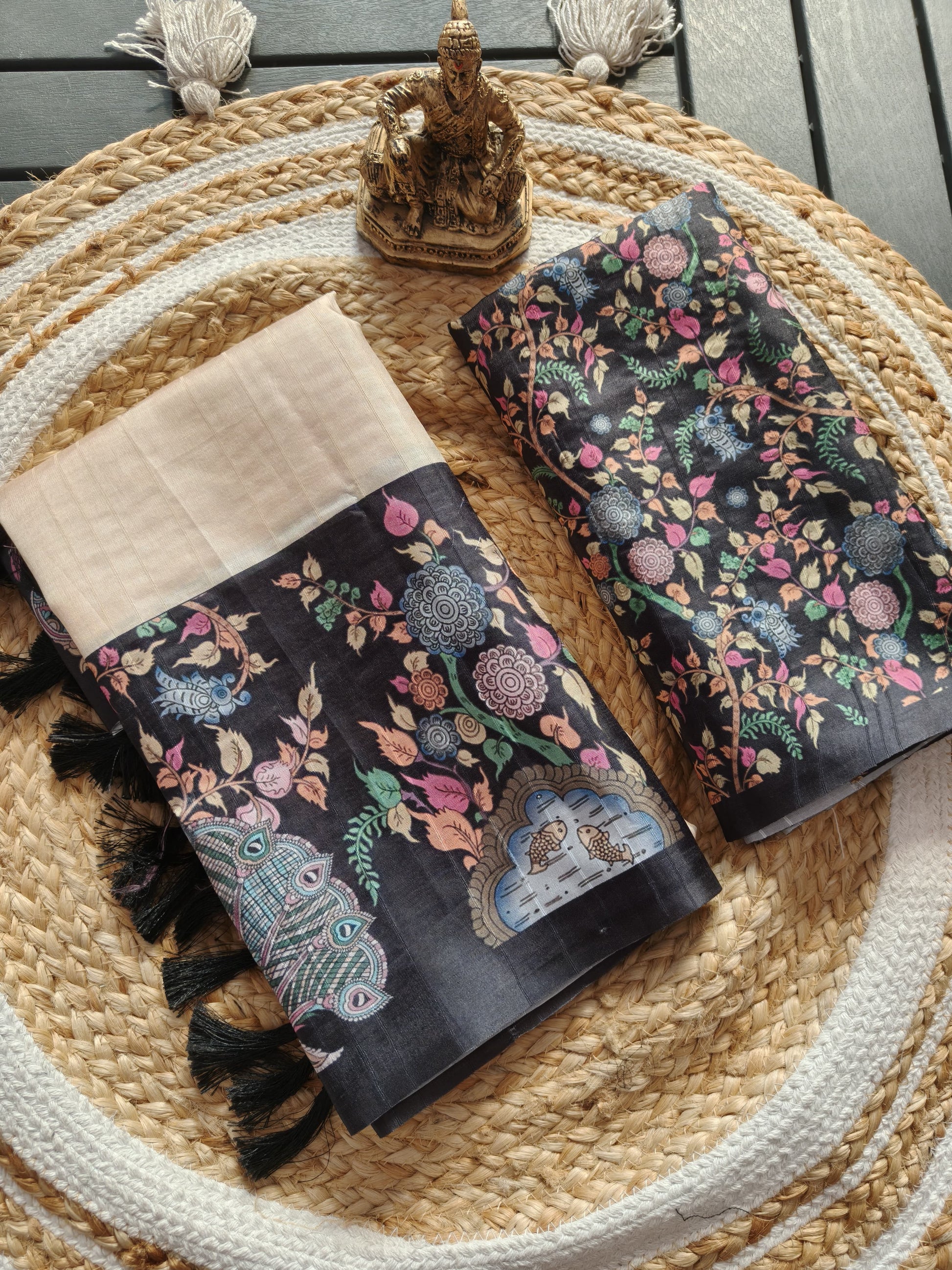 Saree Fabric: Heavy handloom tussar silk saree with gajraj chitrakala digital print