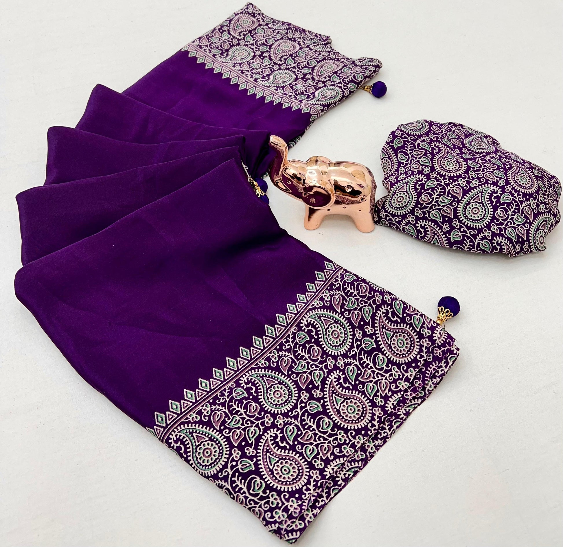 Fabric - Pure Satin with Ajrak printed Sarees rich Pallu with heavy tussle